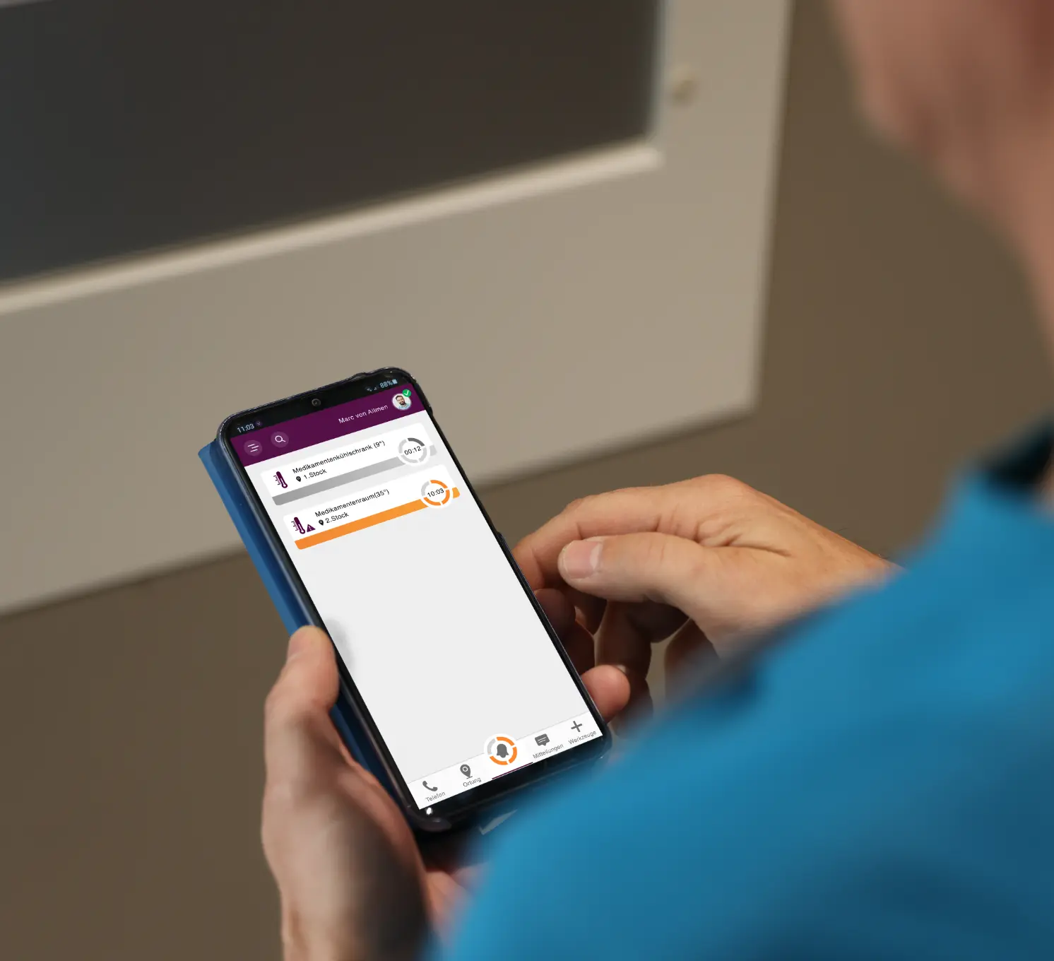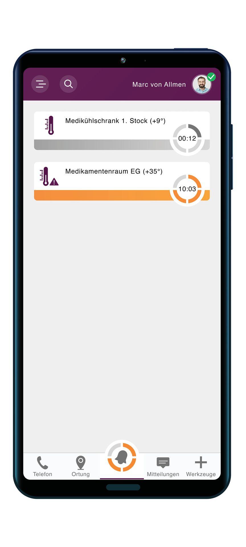 Die vom Sensor ausgelösten Alarme werden – analog zu allen anderen Alarmen – direkt in der motica care App dargestellt. Sobald der Sensor eine Abweichung vom individuell definierten Schwellenwert erkennt, wird automatisch ein Alarm ausgelöst und mit einem eindeutigen Icon auf dem Smartphone angezeigt.